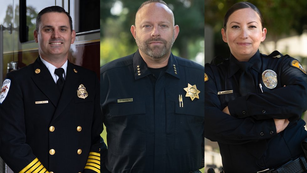 These first responders, who learned their trades from local experts at Merced College, make the slogan true—new City of Merced Fire Chief Casey Wilson, new Dos Palos Police Chief Dayton Snyder, and Gustine Police Reserve Officer Monica Marrot, who recently took the oath.